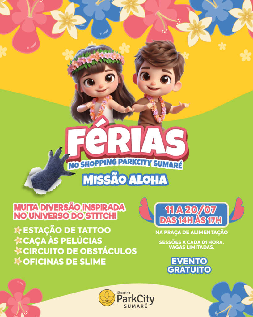A programação de férias “Missão Aloha” reforça as opções de entretenimento que o Shopping ParkCity Sumaré oferece para as famílias neste período, como o cinema, a loja Happy Kids – com brinquedos e estações de jogos -, os carrinhos motorizados da Stop Go e o ParkCity Play, playground gratuito para os pequenos.